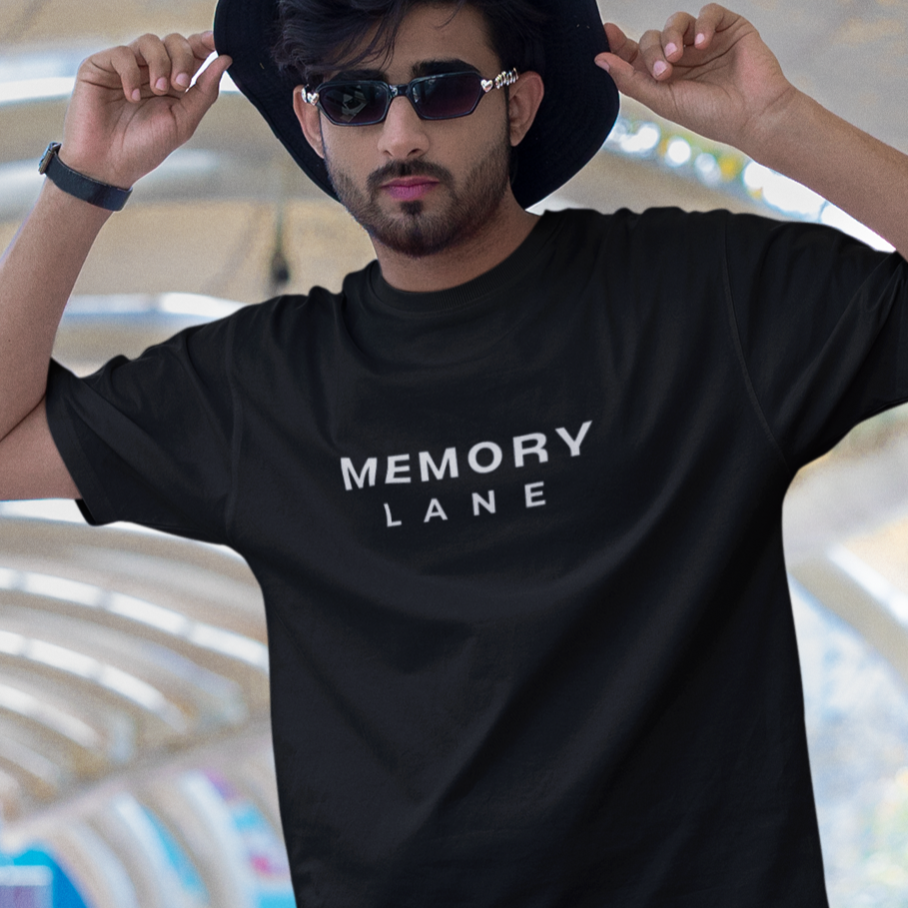 Na frente, o logo Memory Lane em branco sobre a base preta da camisa — simples, marcante, eterno.