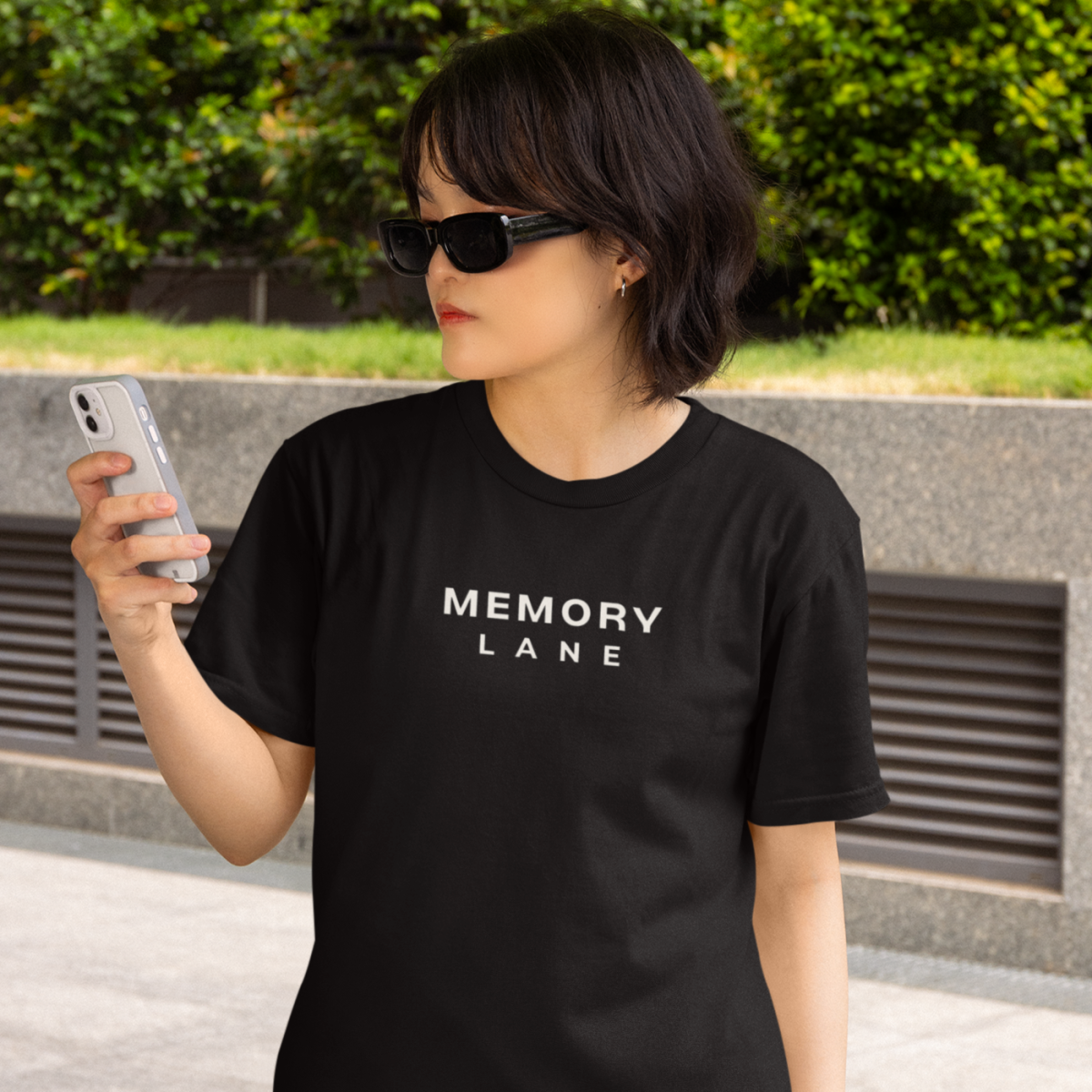 Na frente, o tradicional logo Memory Lane em branco, minimalista, direto ao ponto.