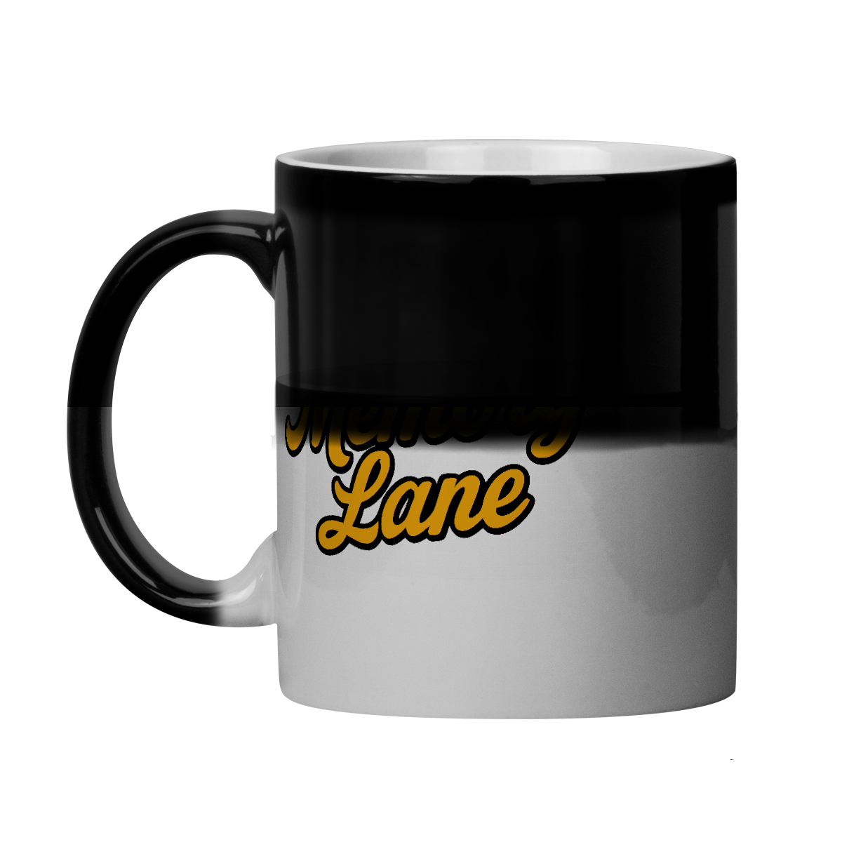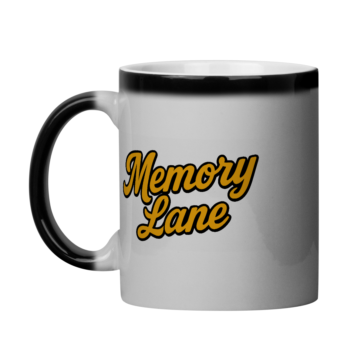 Quando fria, a caneca parece totalmente preta. Mas ao adicionar uma bebida quente, surge a estampa do nome Memory Lane em tipografia retrô na marcante cor mostarda, trazendo à tona aquele ar vintage que só quem viveu (ou sente) os anos 80 e 90 conhece bem.